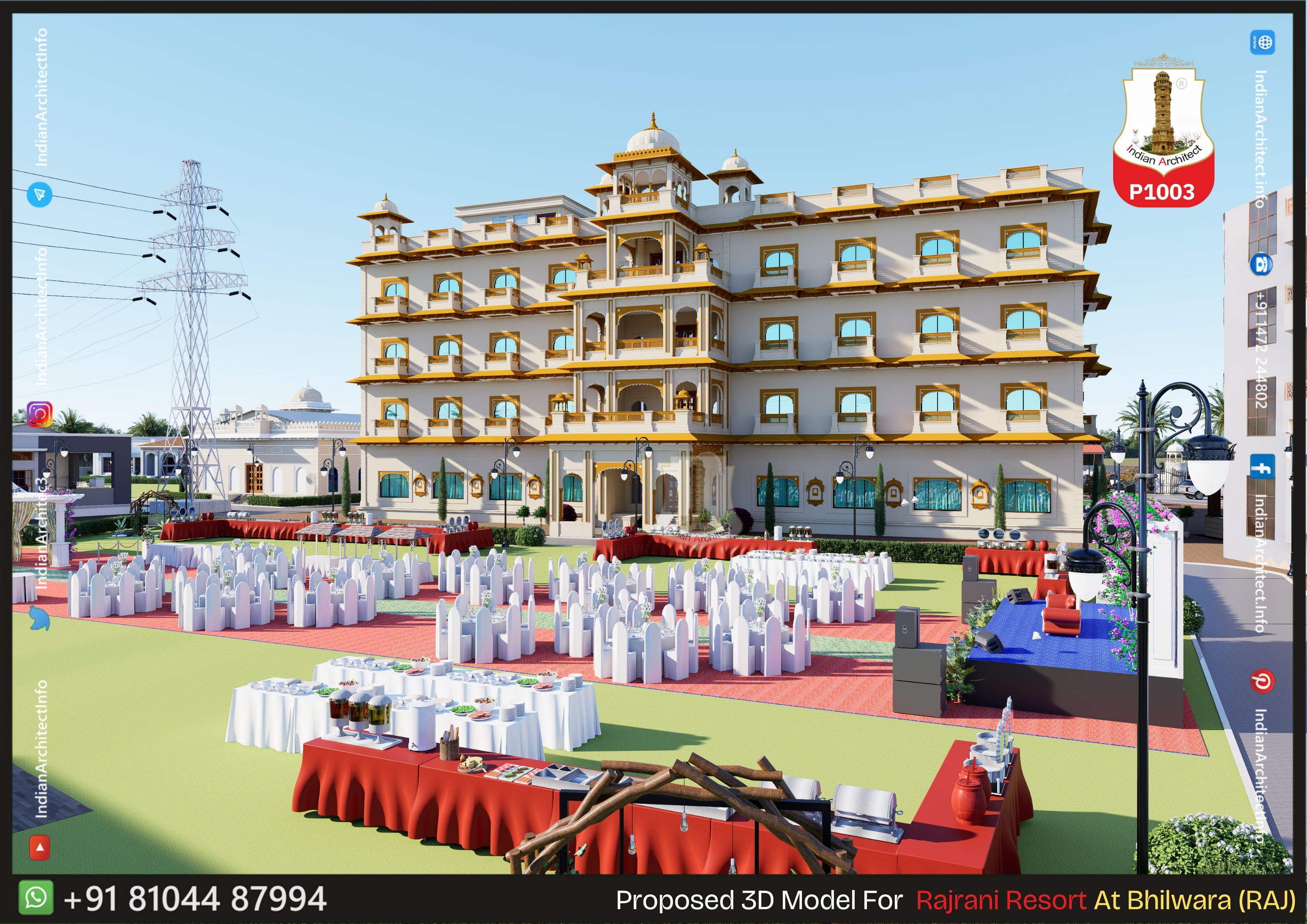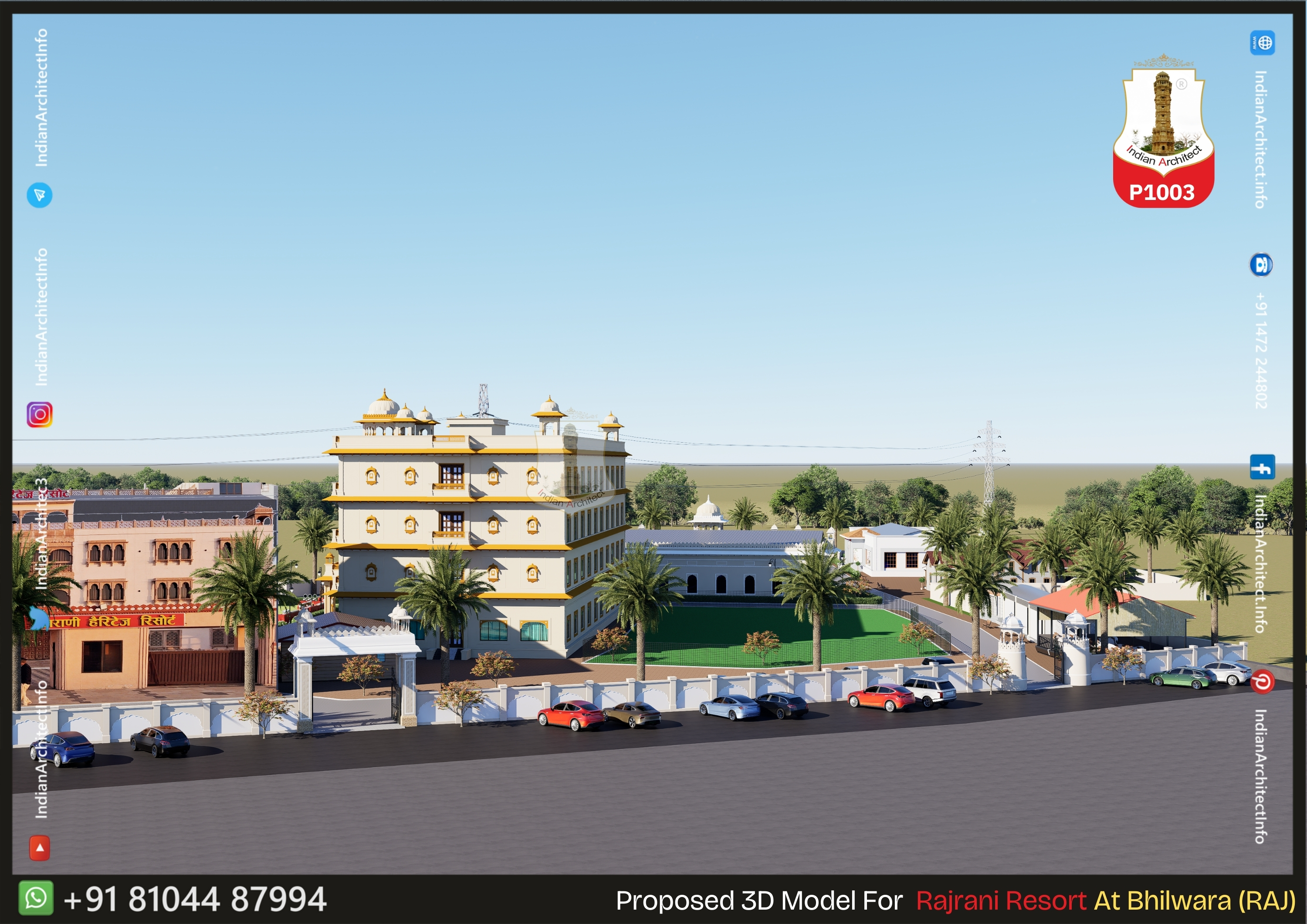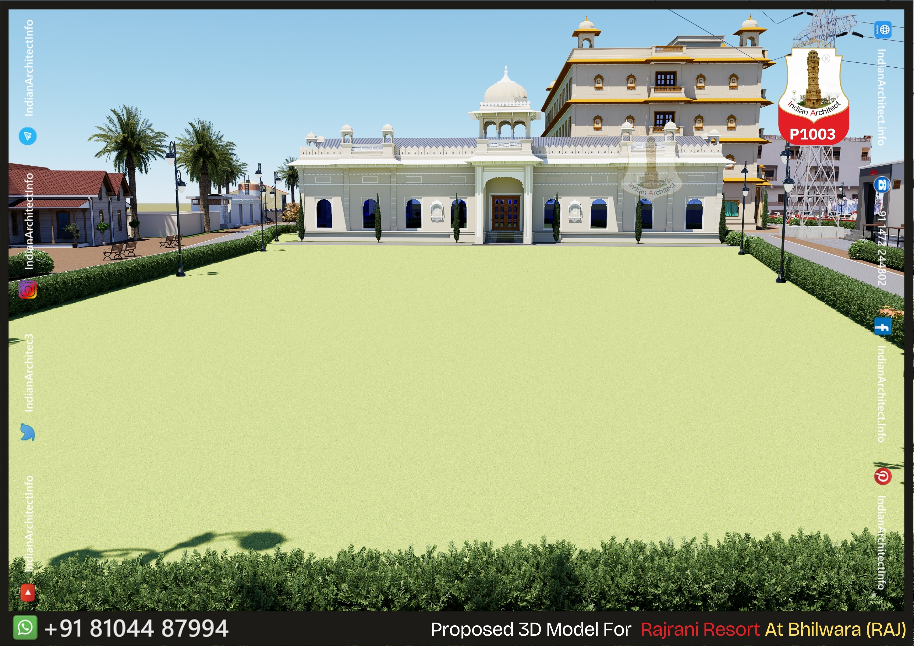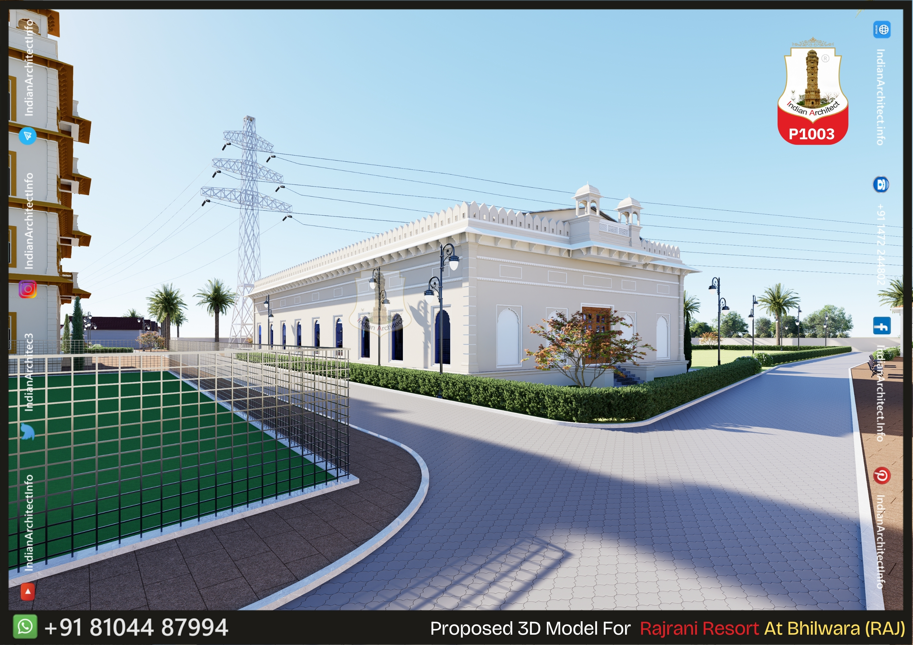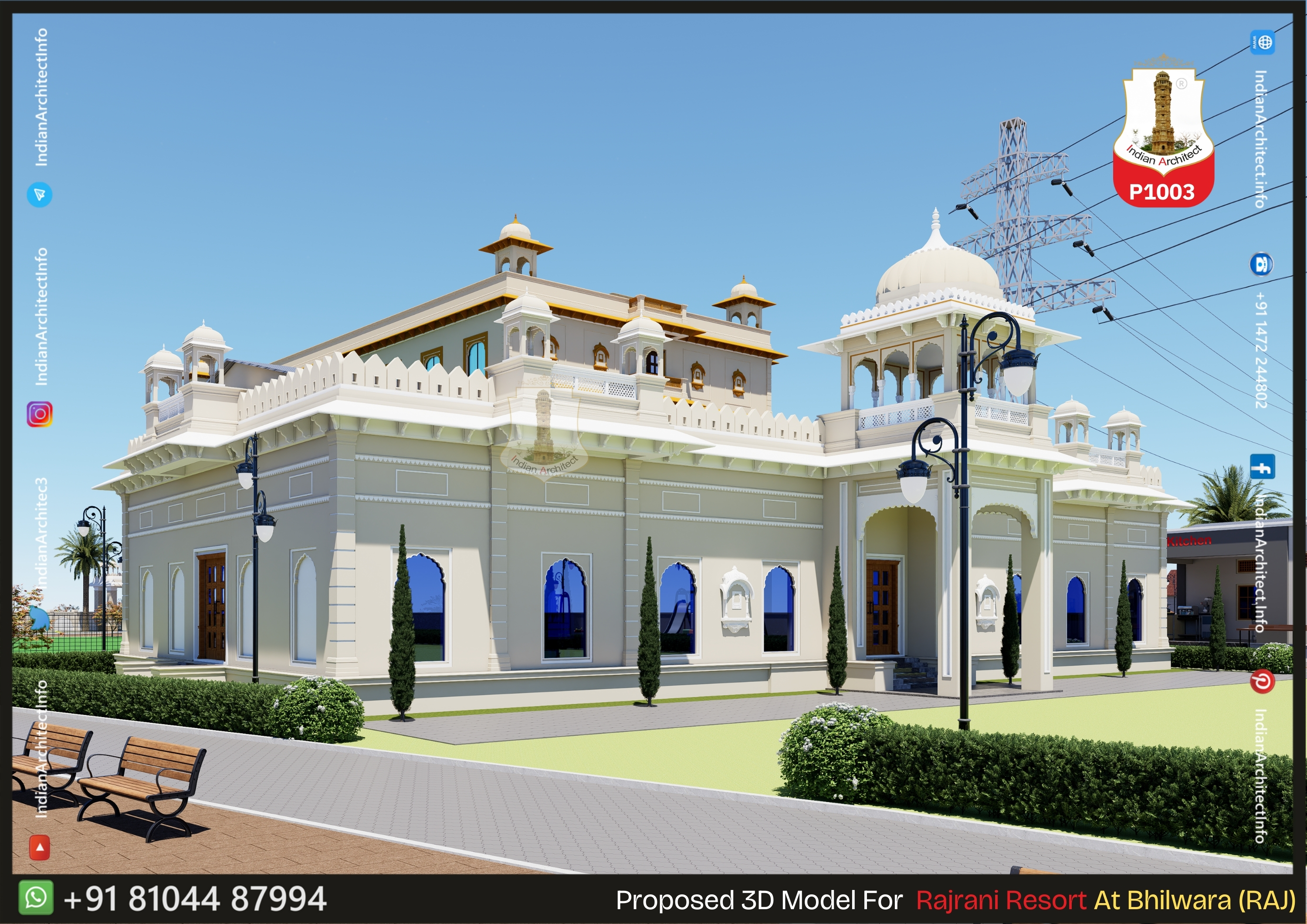 Chhatri Elements: Decorative Chhatris (domed pavilions) are placed on the rooftop and corners, which are iconic symbols of Indian heritage architecture.