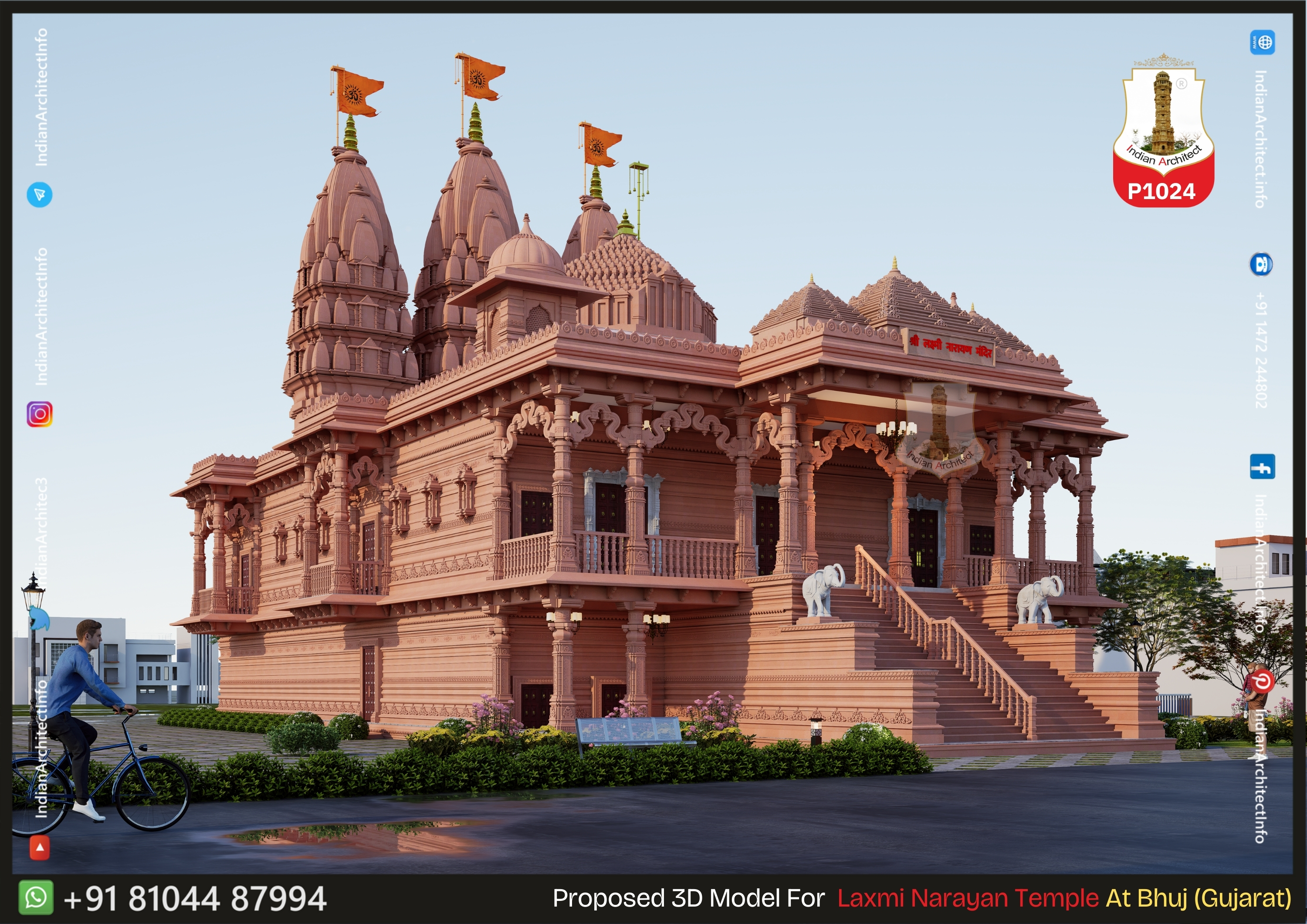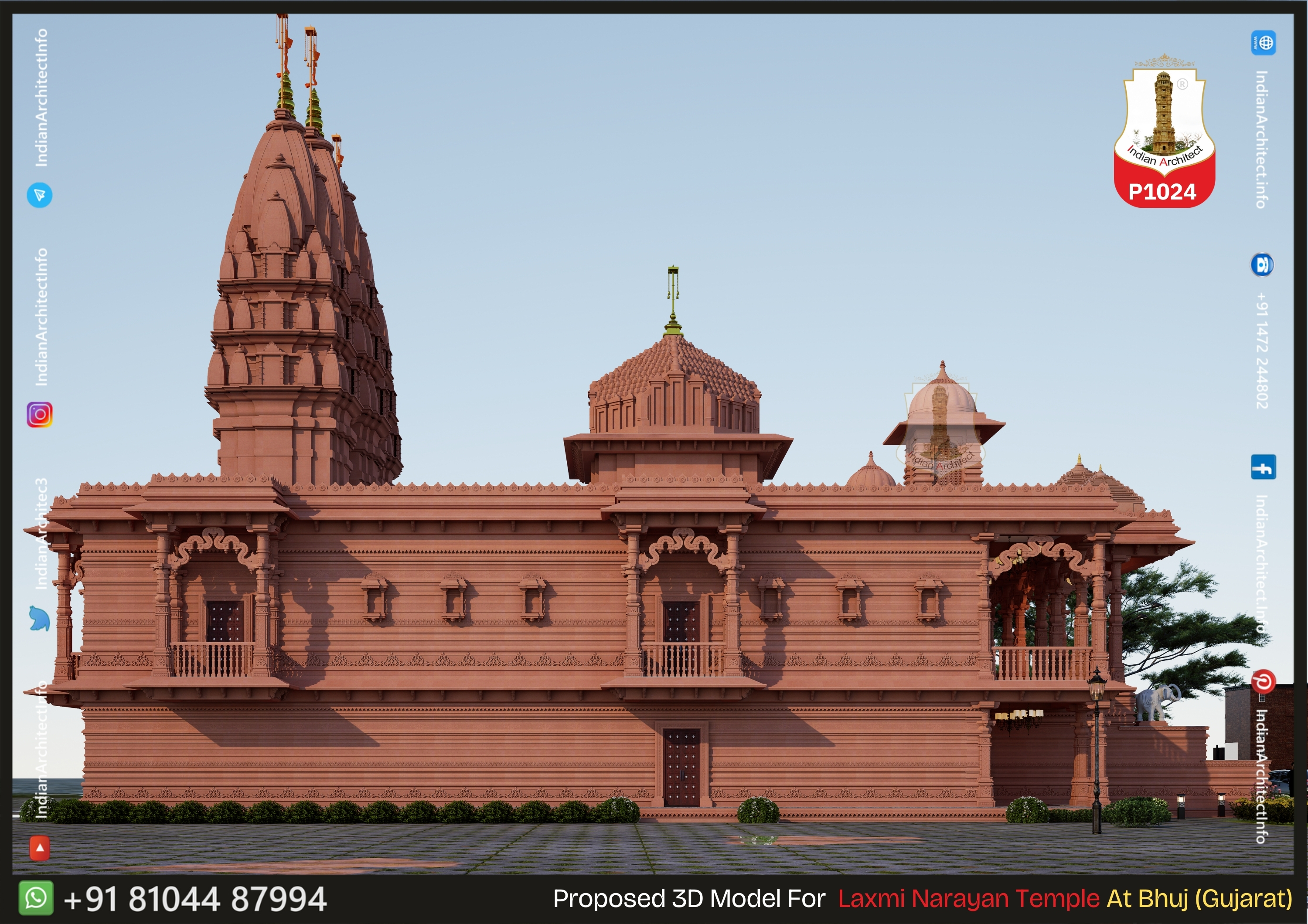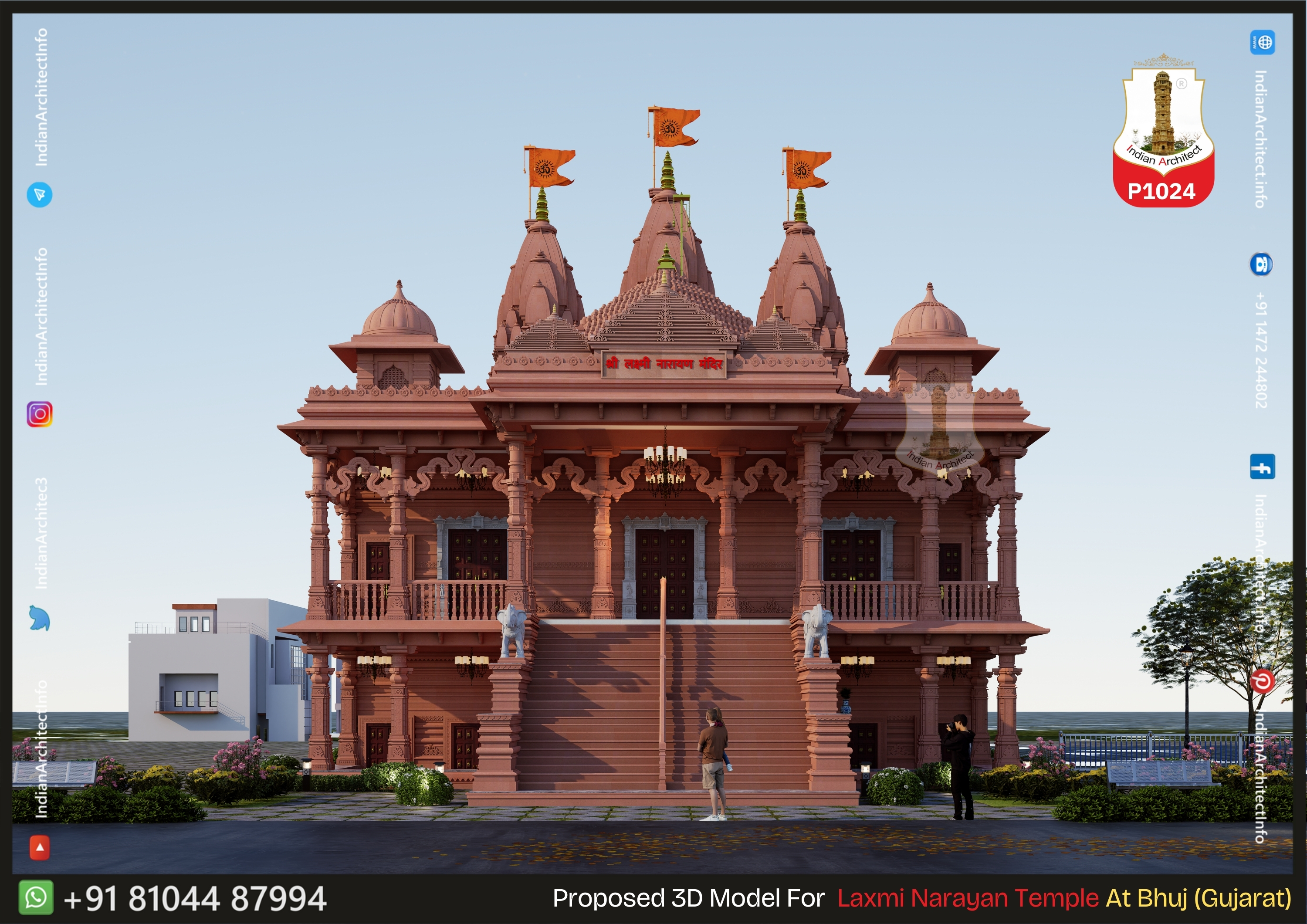 Material & Texture: The exterior showcases a Pink Sandstone finish, giving it a soft, regal appearance reminiscent of the famous temples in Rajasthan and Gujarat.