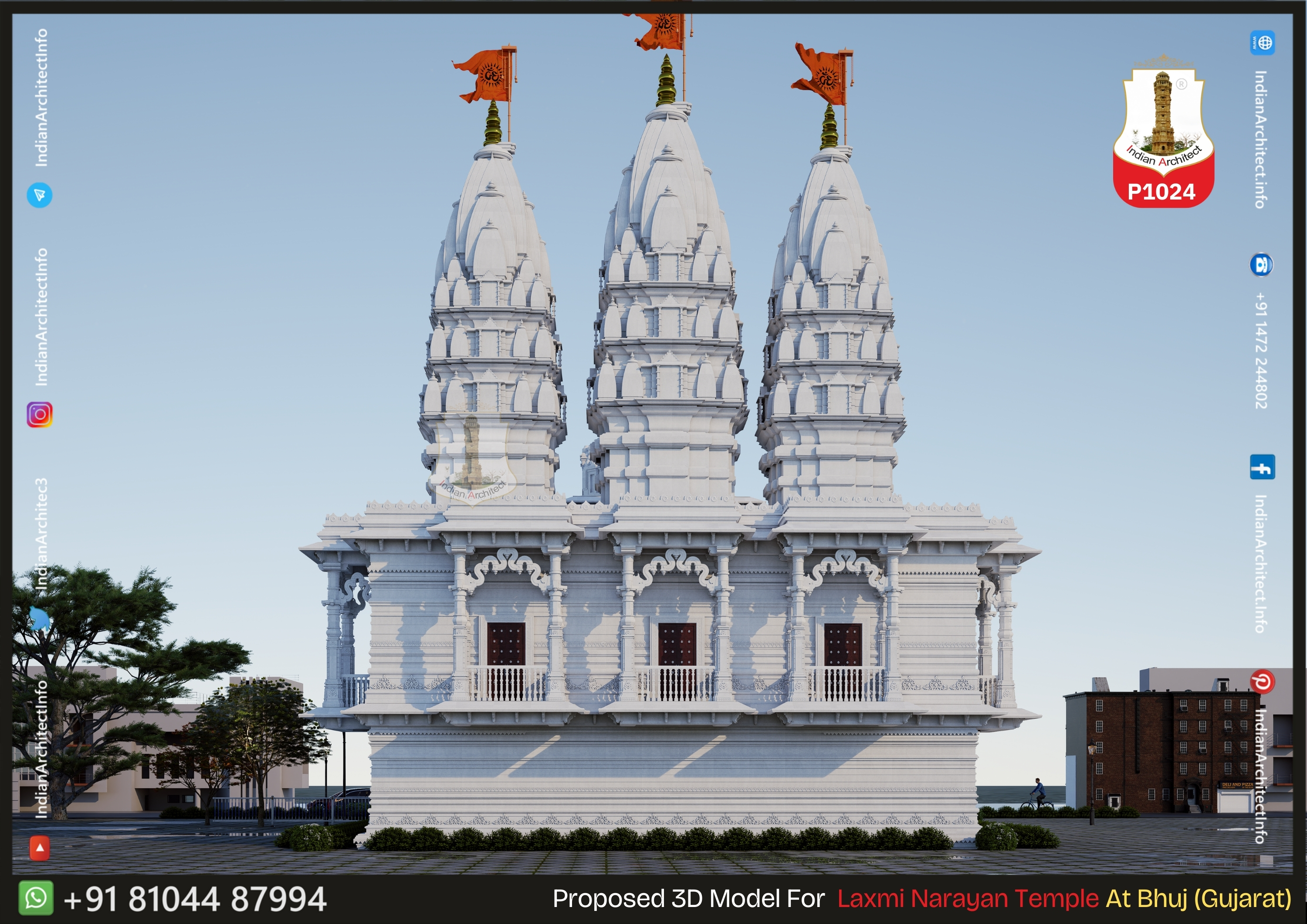 Triple Shikhara: The temple features three prominent Shikharas (spires). The central one is the tallest, symbolizing the mountain peak (Meru), while the flanking ones provide a balanced, symmetrical aesthetic.