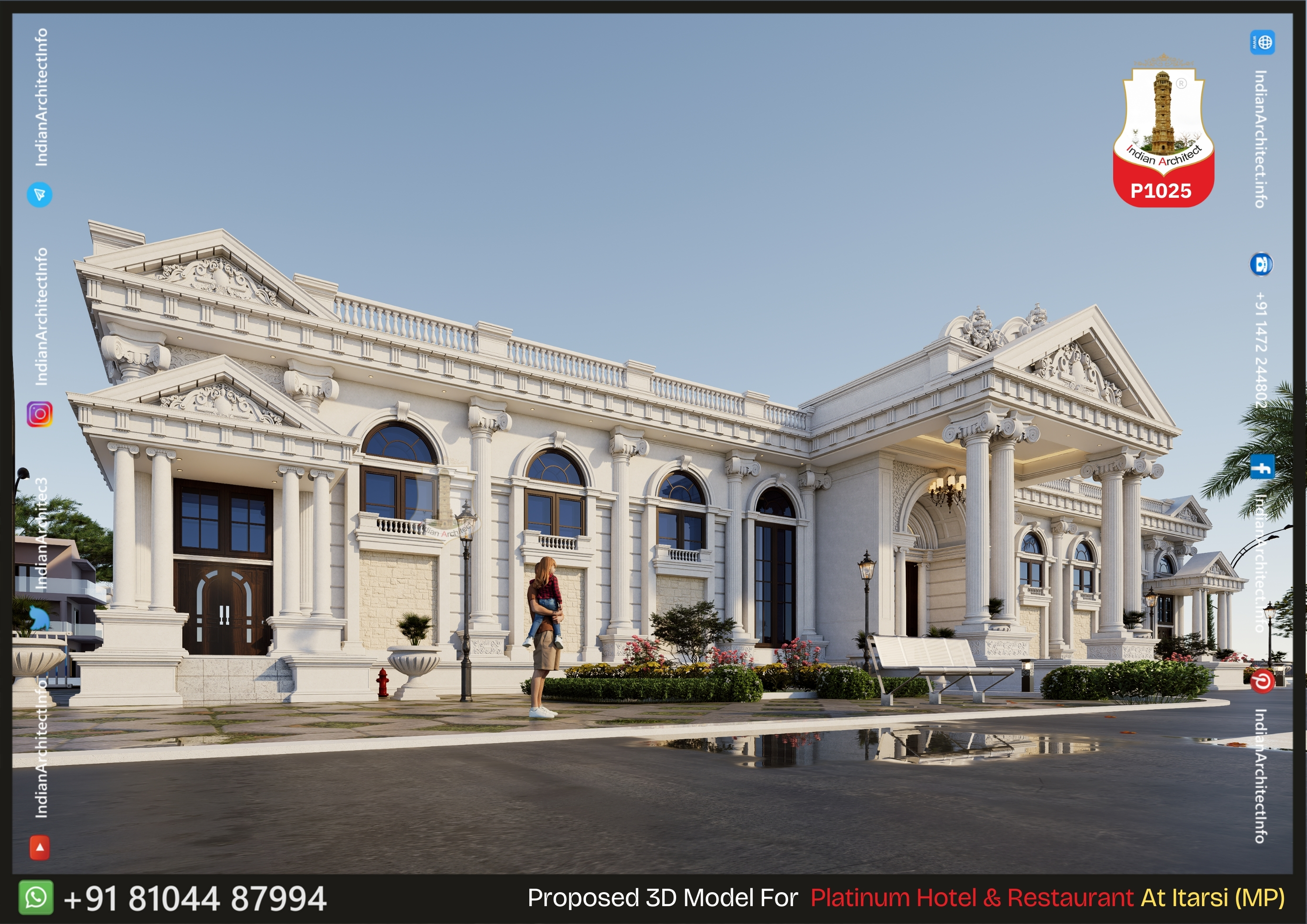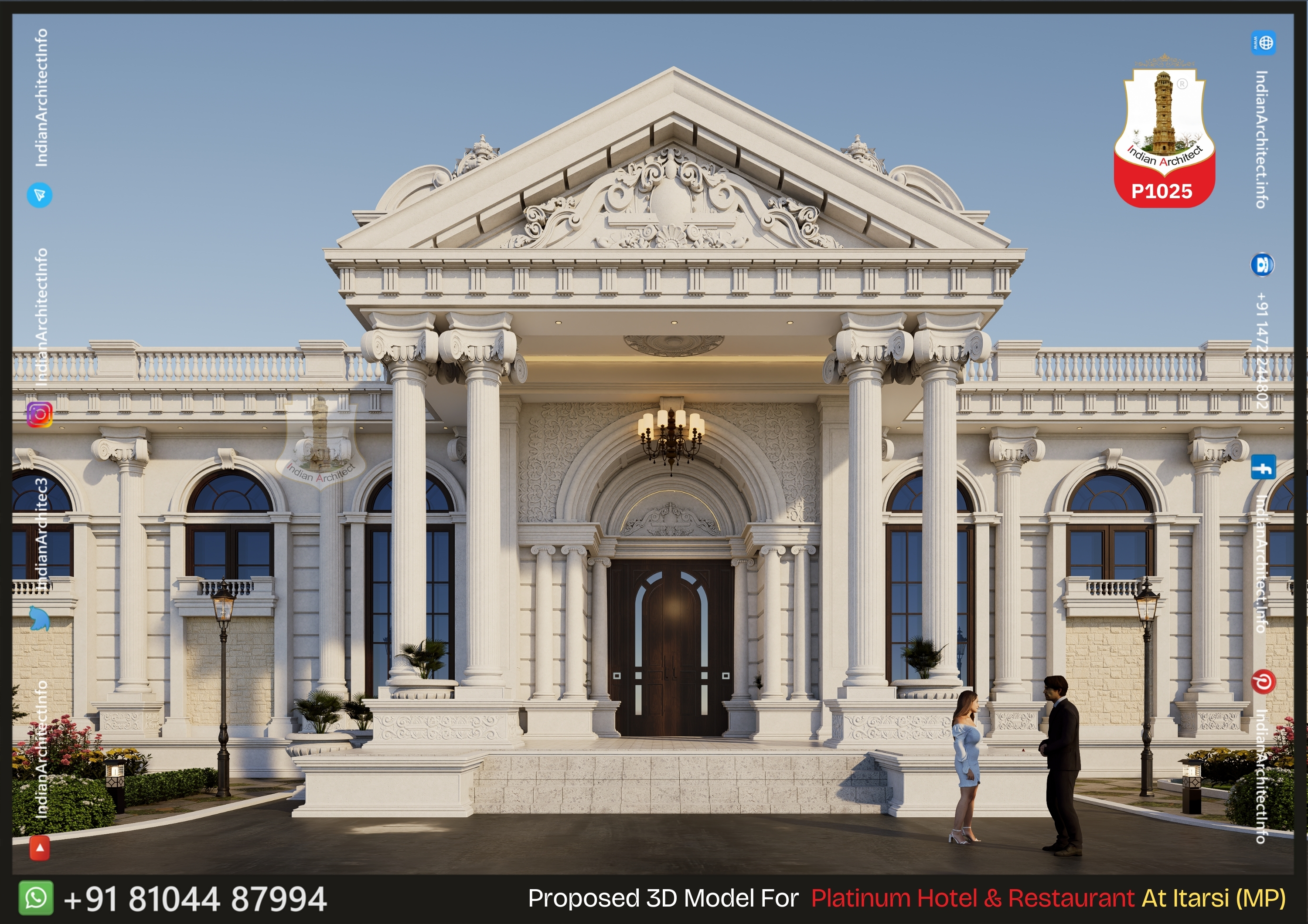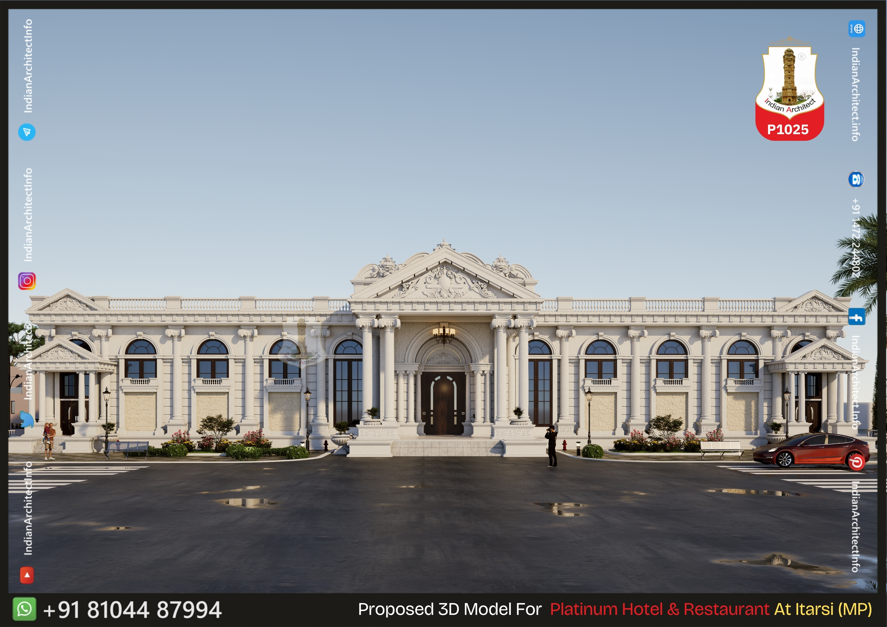 Corinthian-Style Columns: The facade utilizes tall, slender columns with decorative capitals that support the main entablature, reflecting Greco-Roman influence.