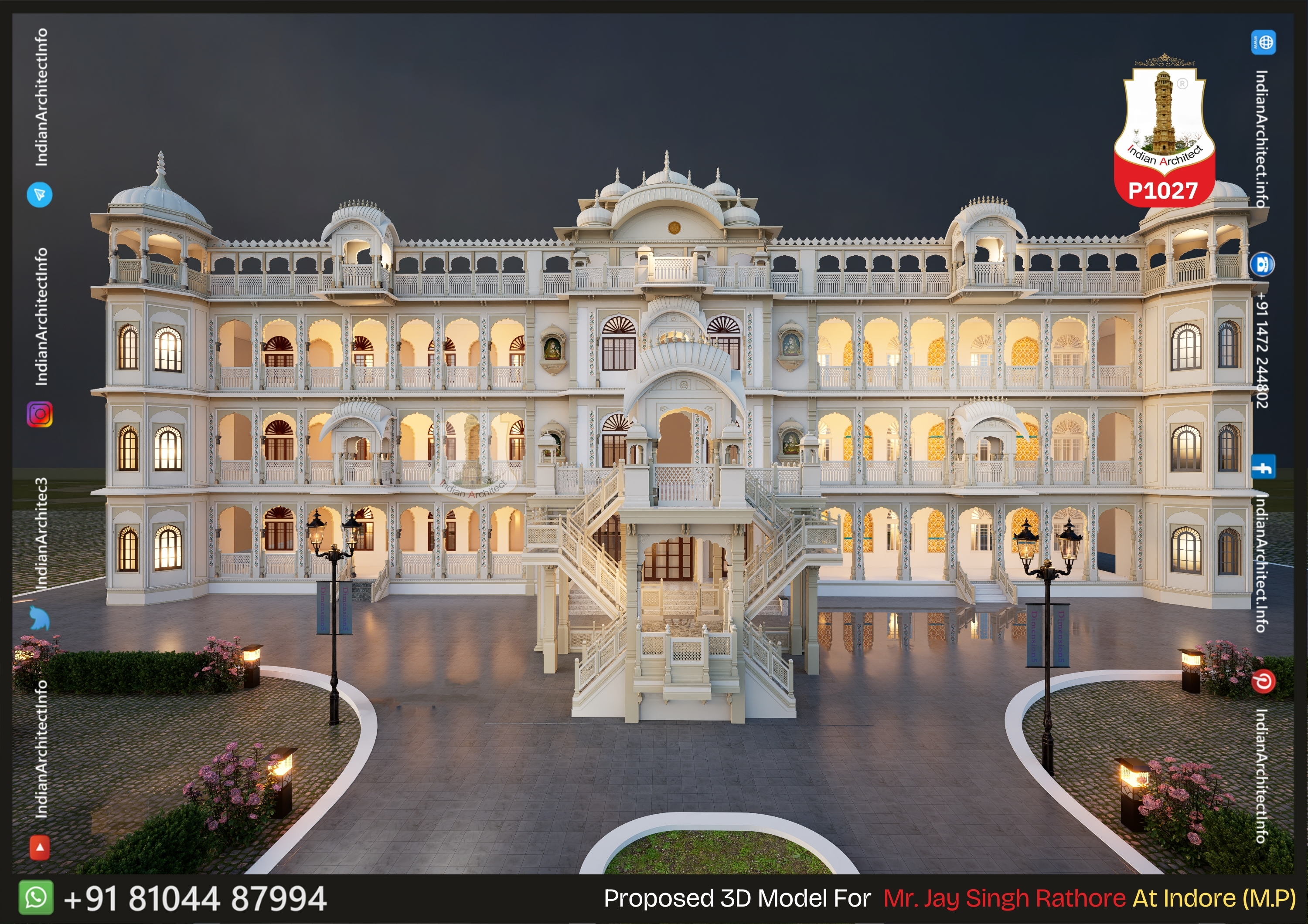 Grand Multilevel Facade: The building features a sprawling four-story elevation that captures the scale and majesty of a traditional Indian palace.