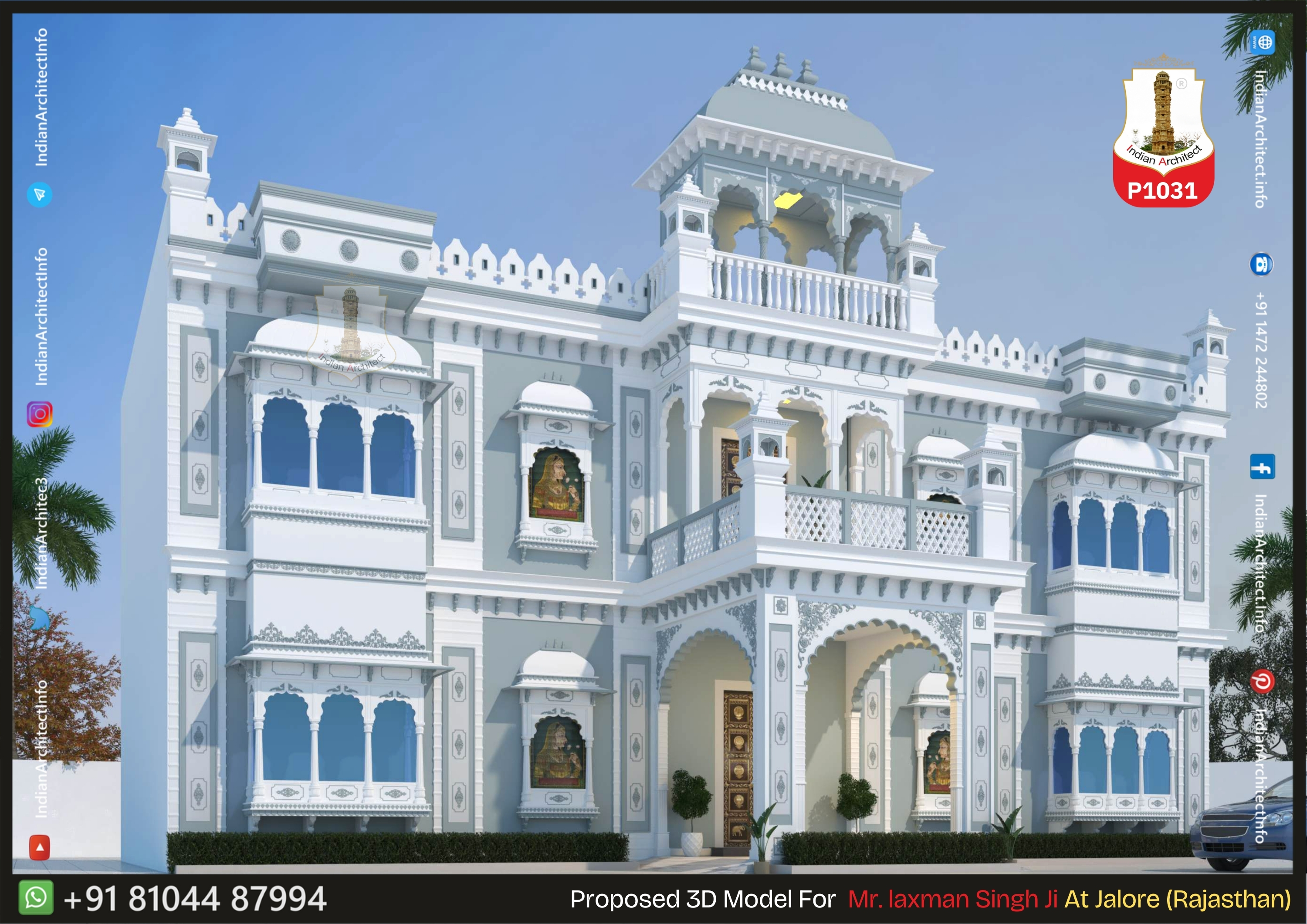 Decorative Parapets: The roofline is finished with "Kangura" or crenelated battlements, typical of historical forts and palaces.
