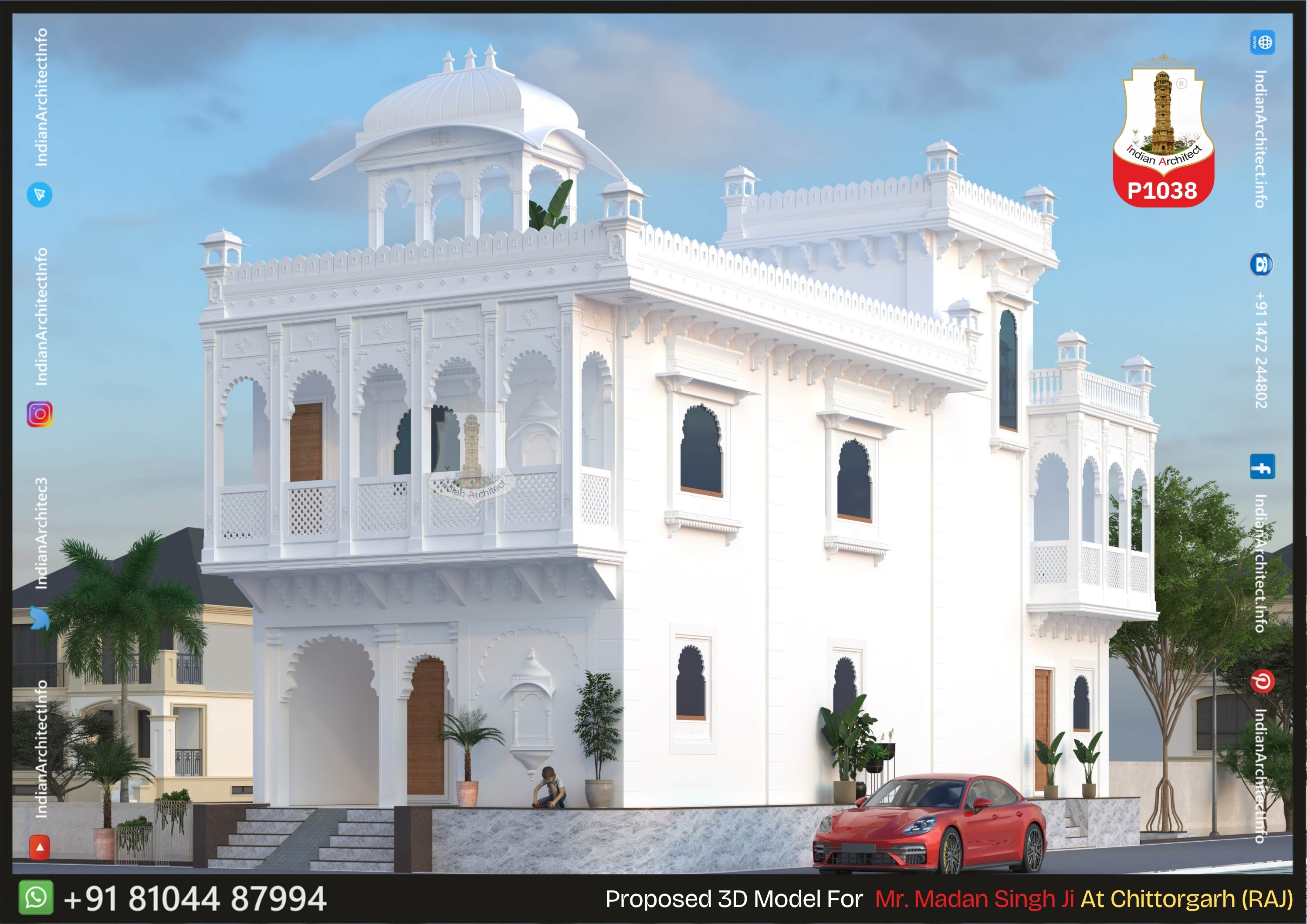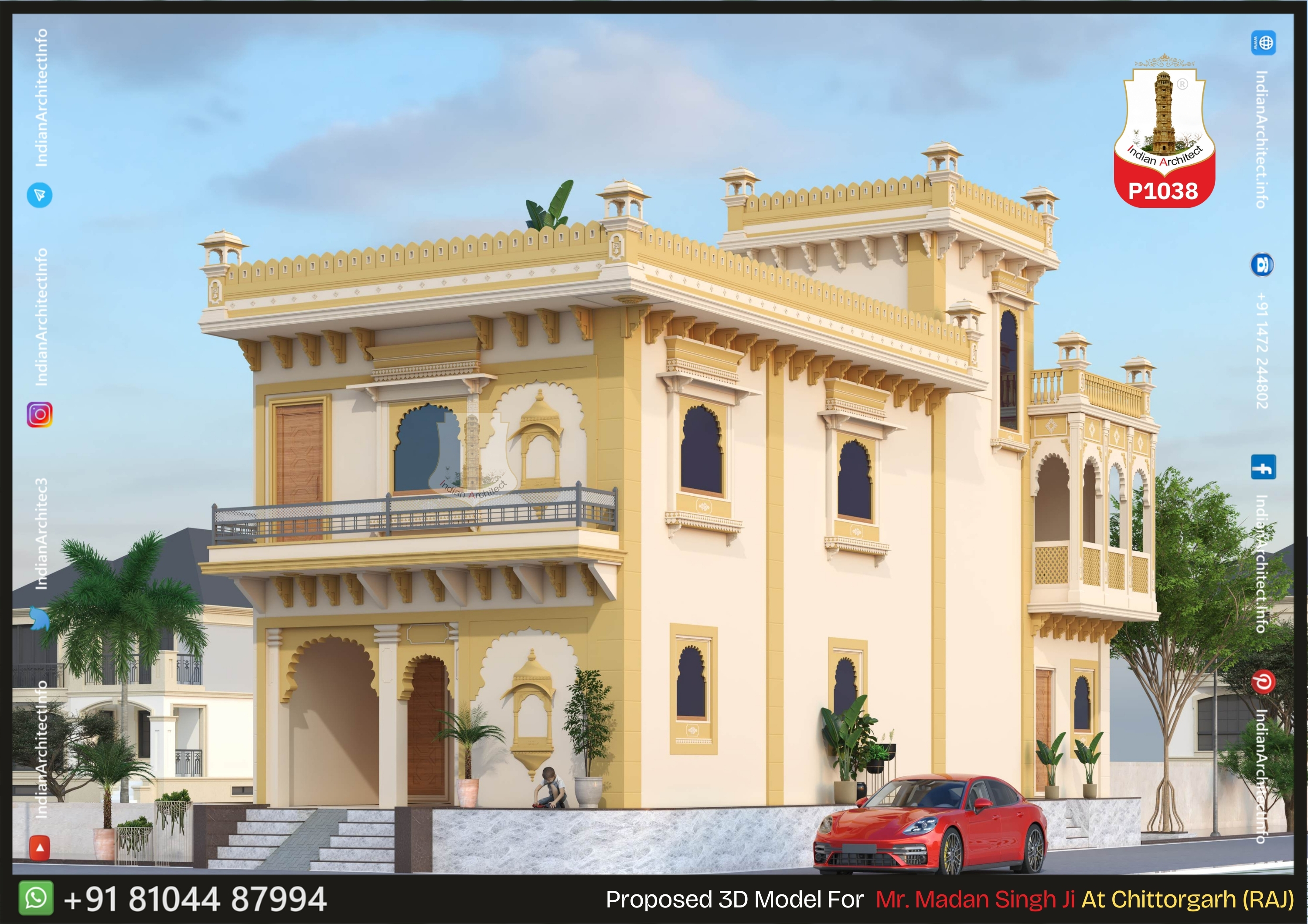 Multifoil Arches: The design utilizes 'Cusped' or 'Multifoil' arches in the balconies and entrance, which is a signature element of Rajasthani heritage architecture.
