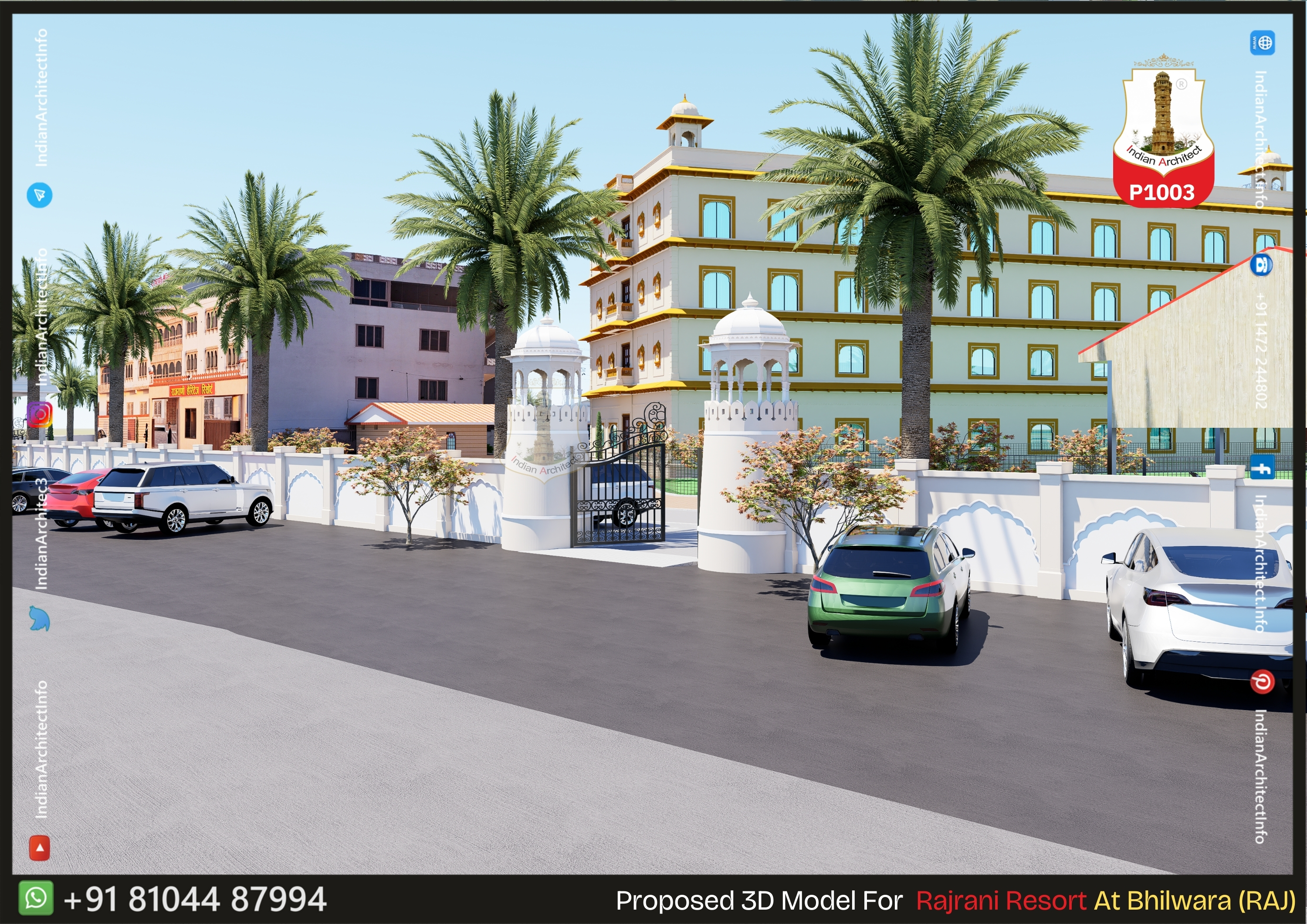 Chhatri Elements: Decorative Chhatris (domed pavilions) are placed on the rooftop and corners, which are iconic symbols of Indian heritage architecture.