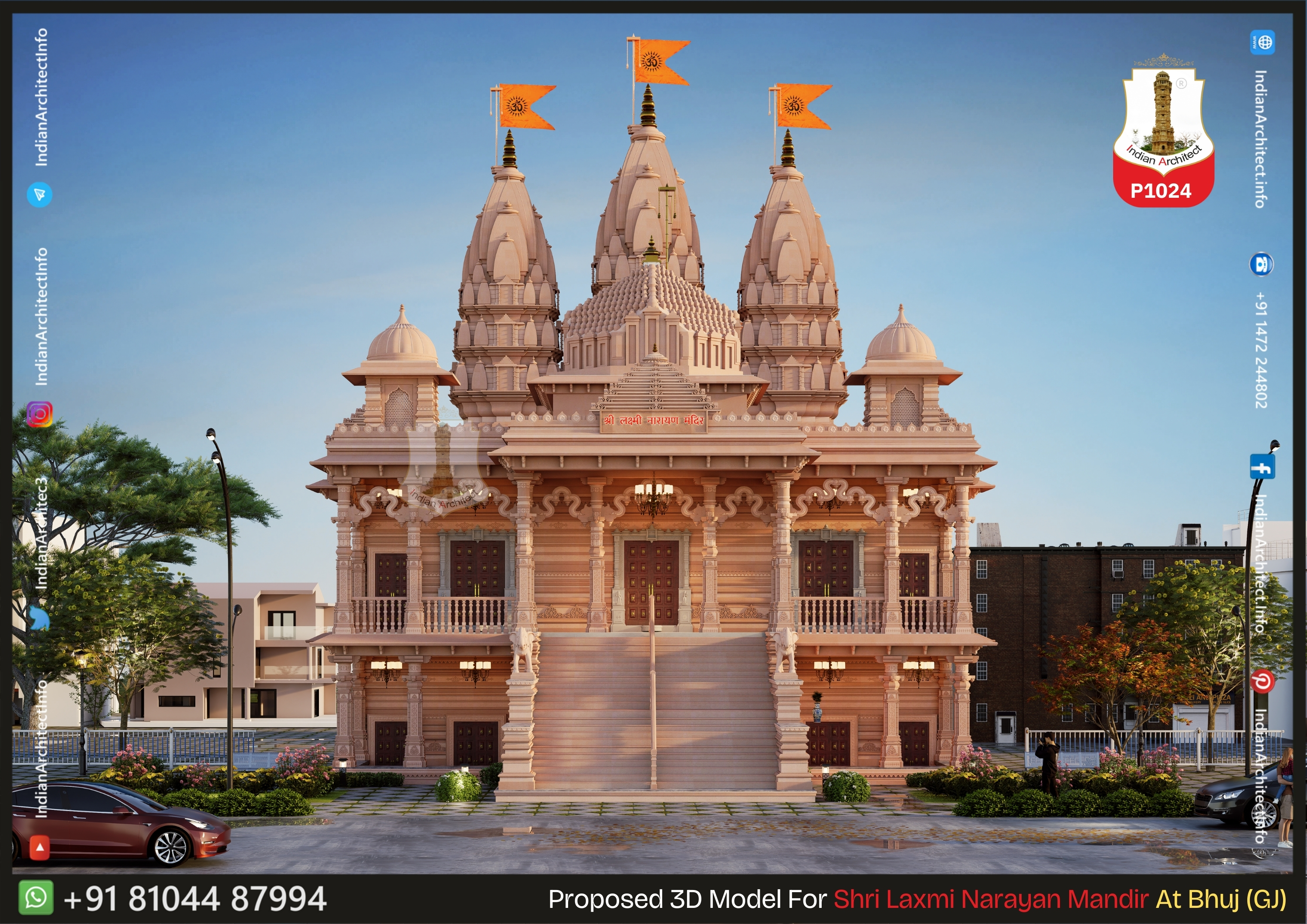 Material & Texture: The exterior showcases a Pink Sandstone finish, giving it a soft, regal appearance reminiscent of the famous temples in Rajasthan and Gujarat.