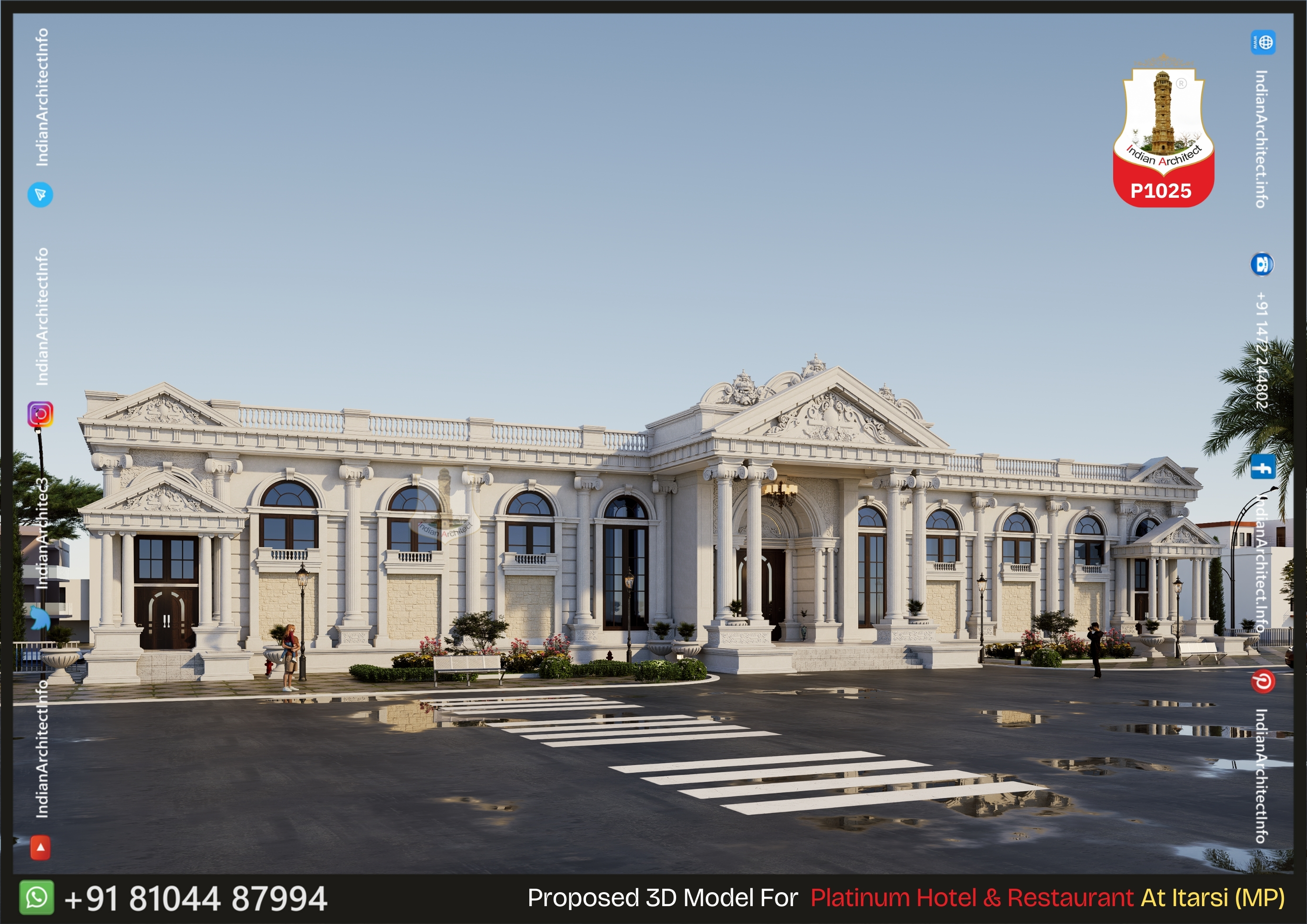 Corinthian-Style Columns: The facade utilizes tall, slender columns with decorative capitals that support the main entablature, reflecting Greco-Roman influence.