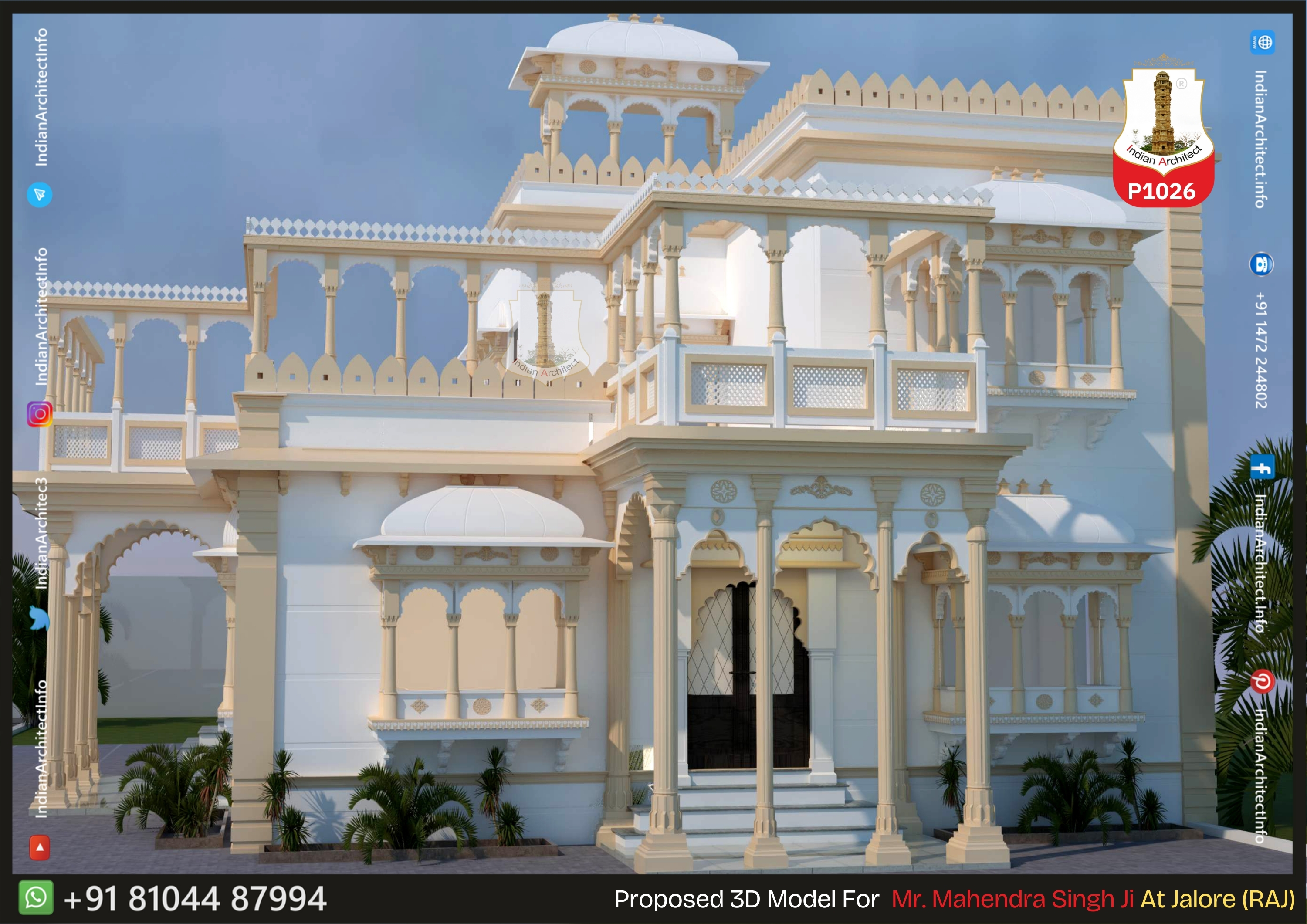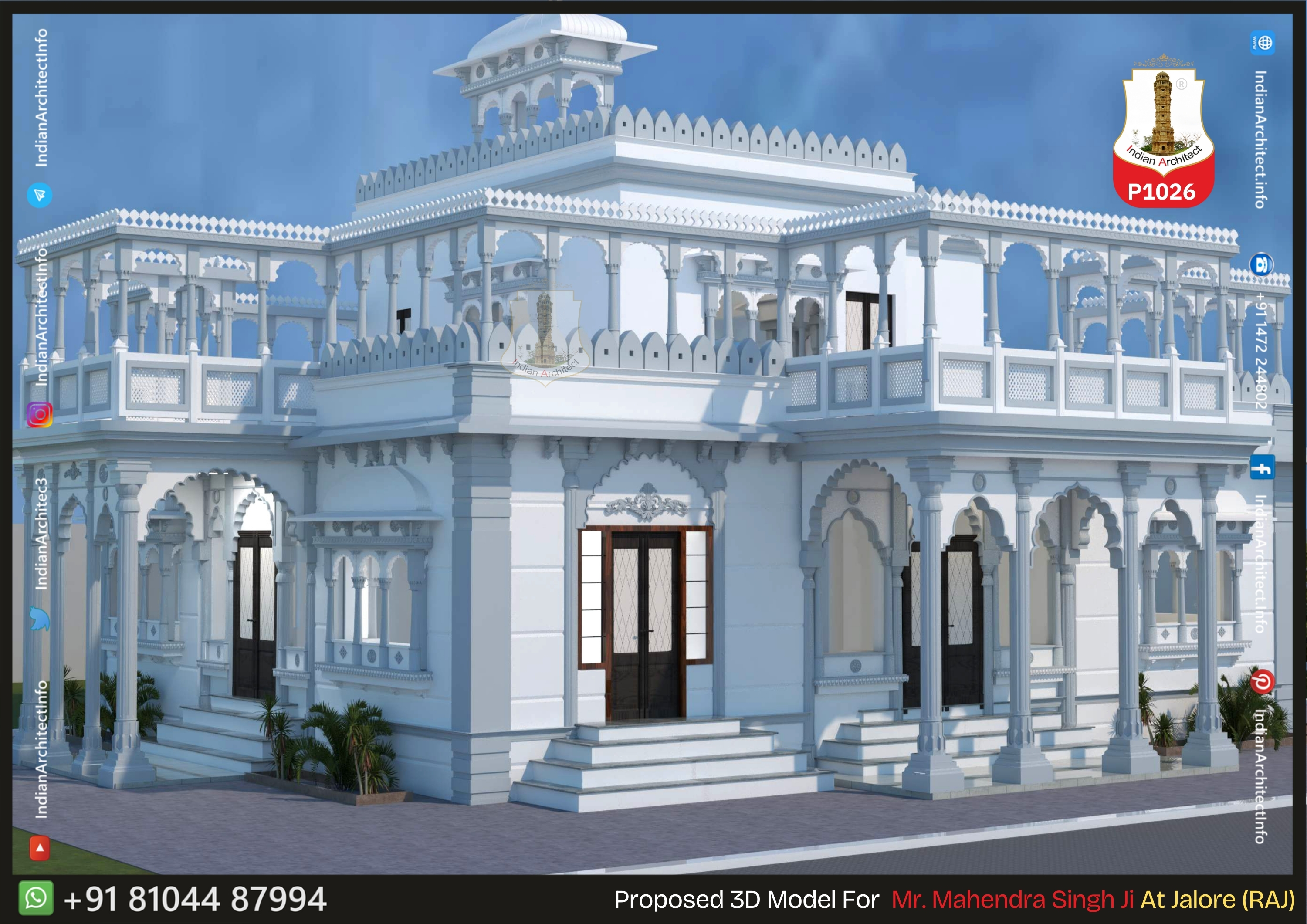 Cantilevered Jharokhas: Beautifully designed Jharokhas (overhanging balconies) with domed tops provide depth and historical character to the first floor.
