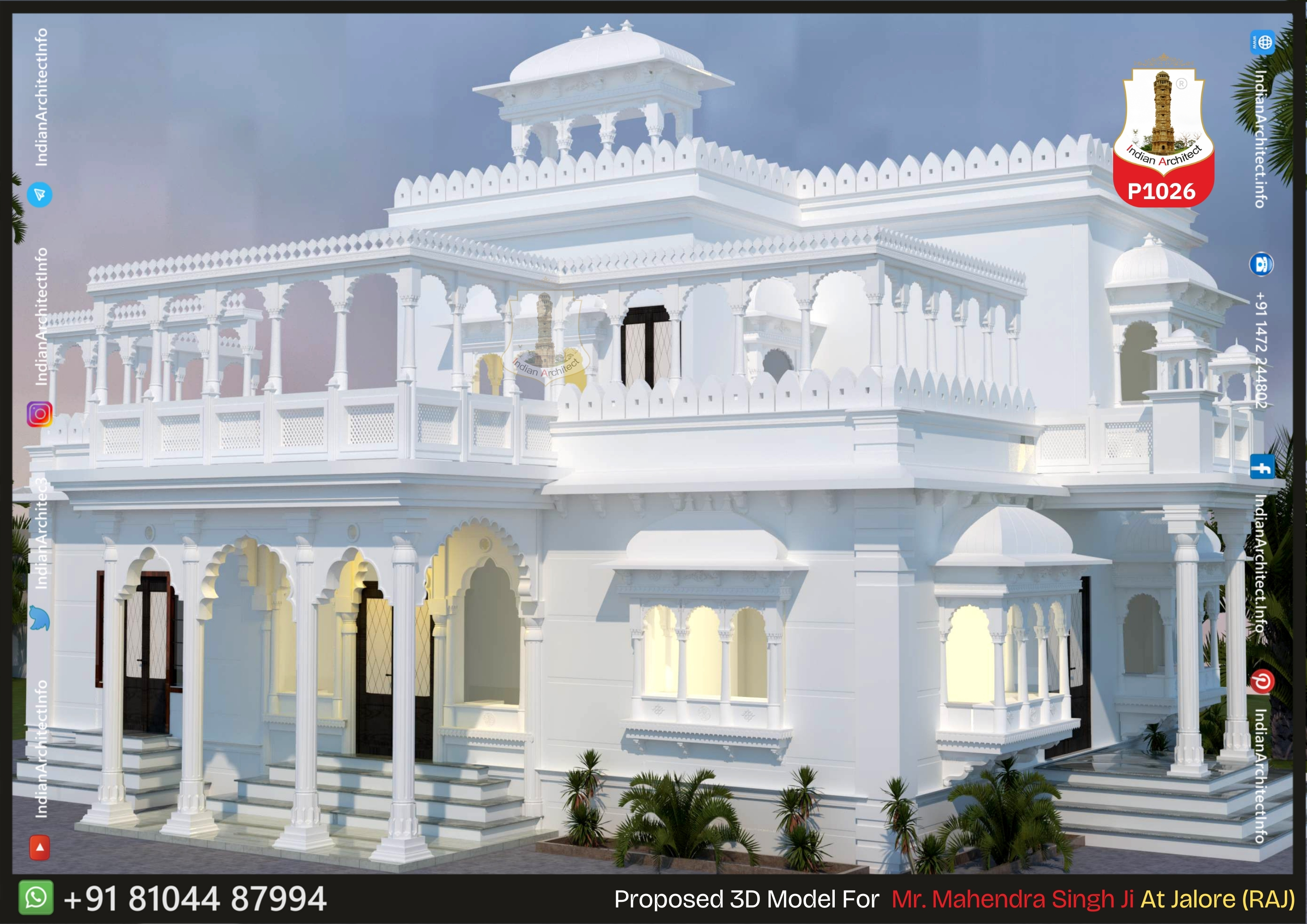 Stone Jaali Work: Fine lattice-work (Jaali) is used in the railings and window panels, allowing for light filtration while maintaining privacy.