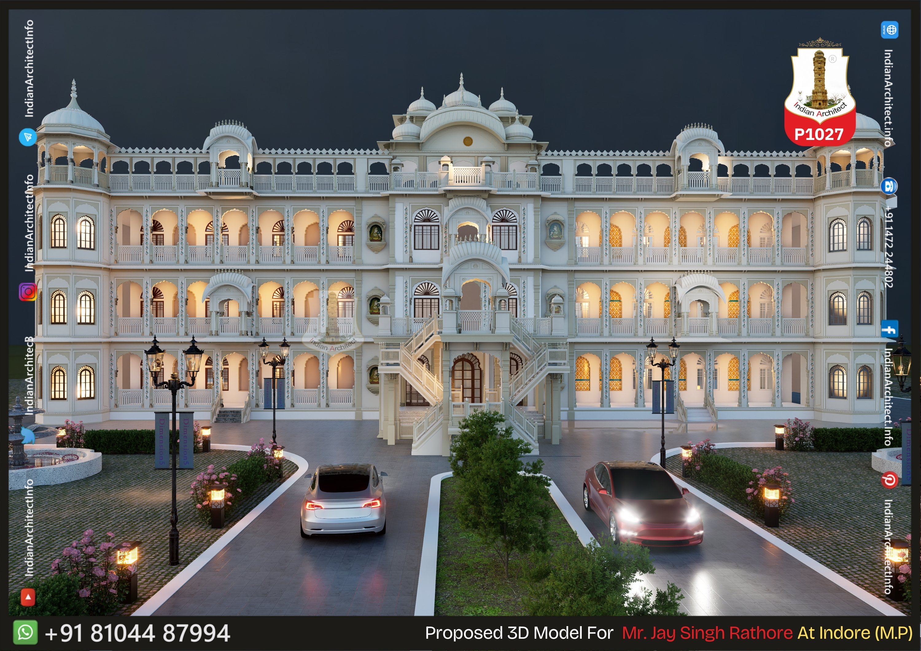 Grand Multilevel Facade: The building features a sprawling four-story elevation that captures the scale and majesty of a traditional Indian palace.
