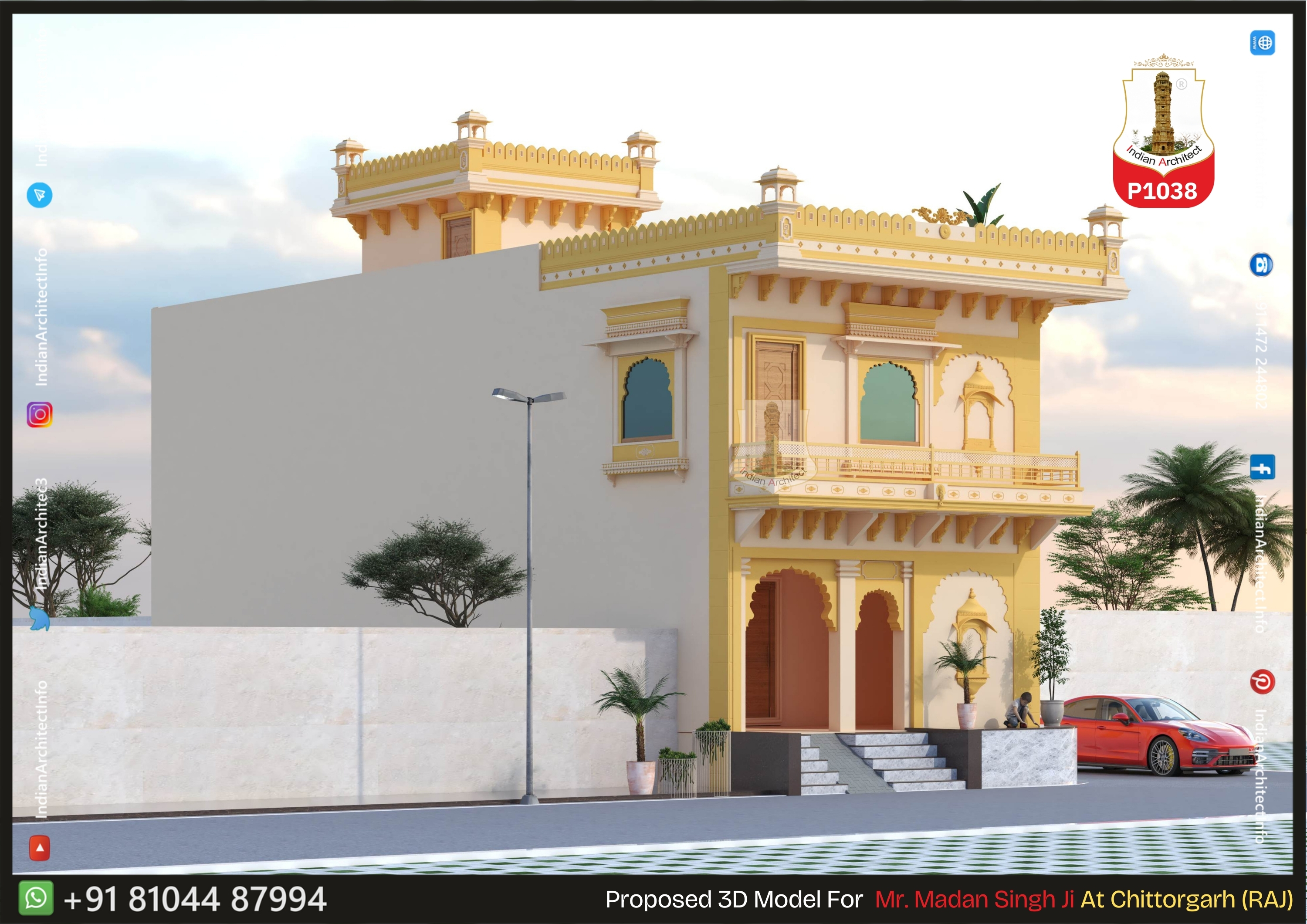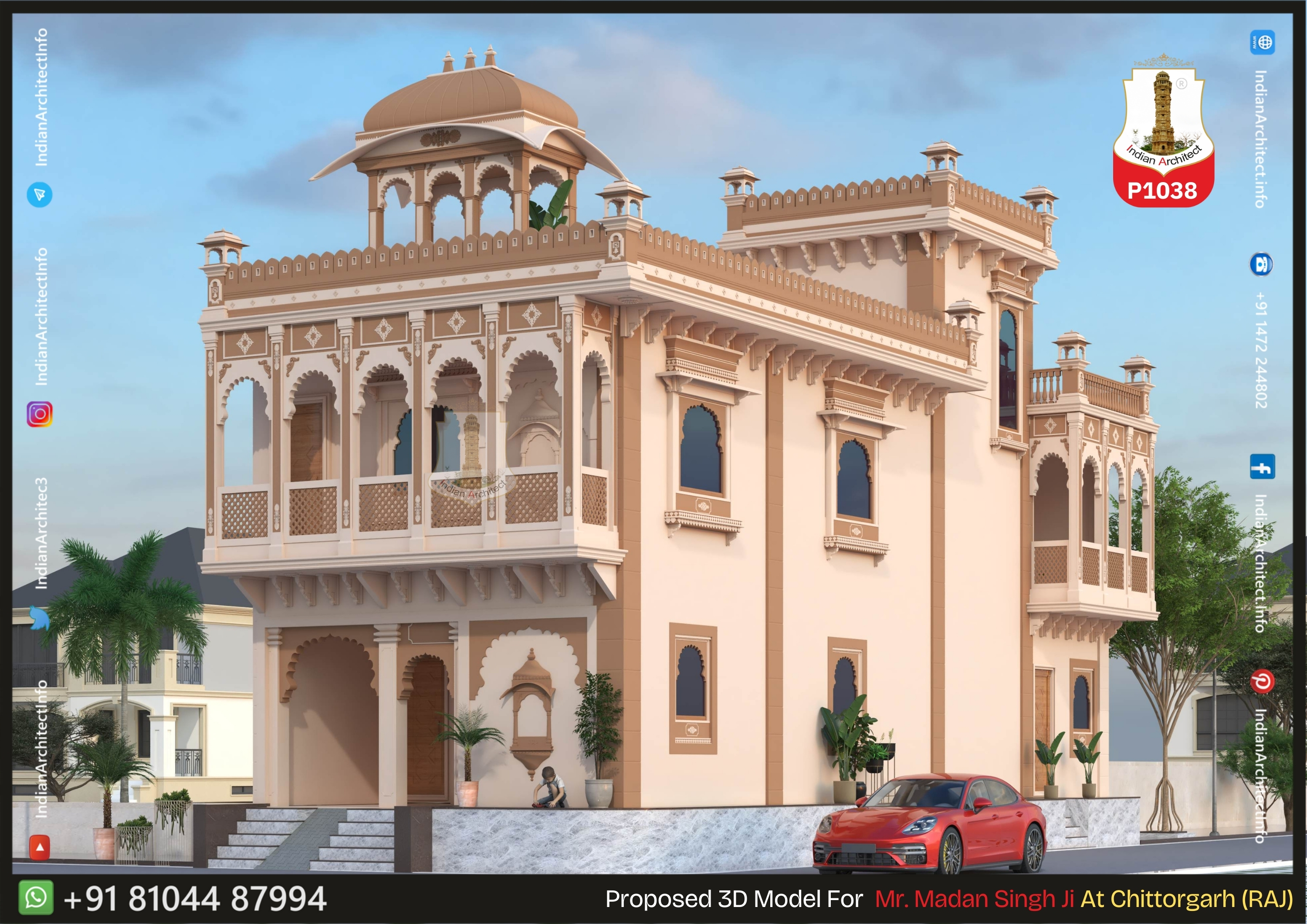 Multifoil Arches: The design utilizes 'Cusped' or 'Multifoil' arches in the balconies and entrance, which is a signature element of Rajasthani heritage architecture.